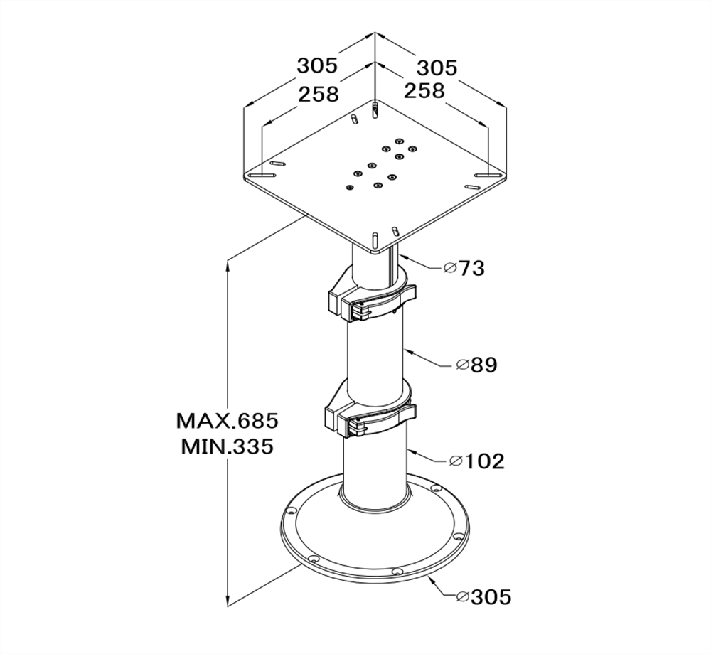 Gas powered pedestal with 305*305mm (12*12 inch) table mount and 305mm (12 inch )diameter floor base with 280mm (11 inch) hole pattern for added stability