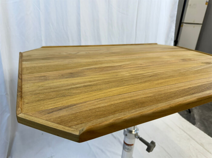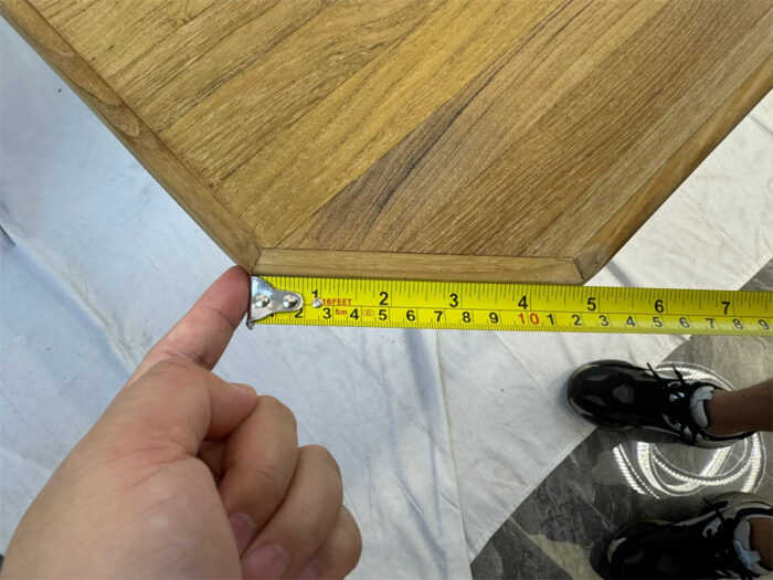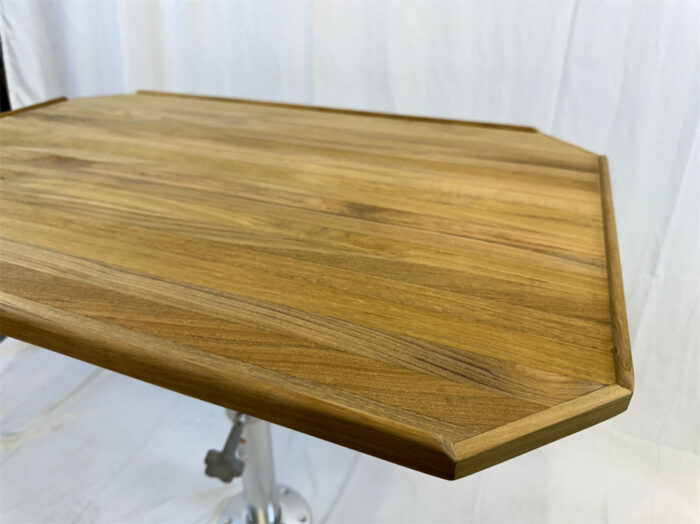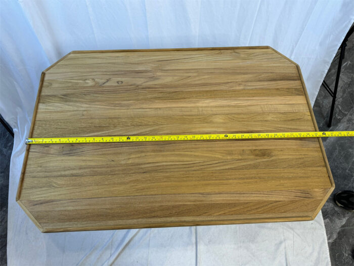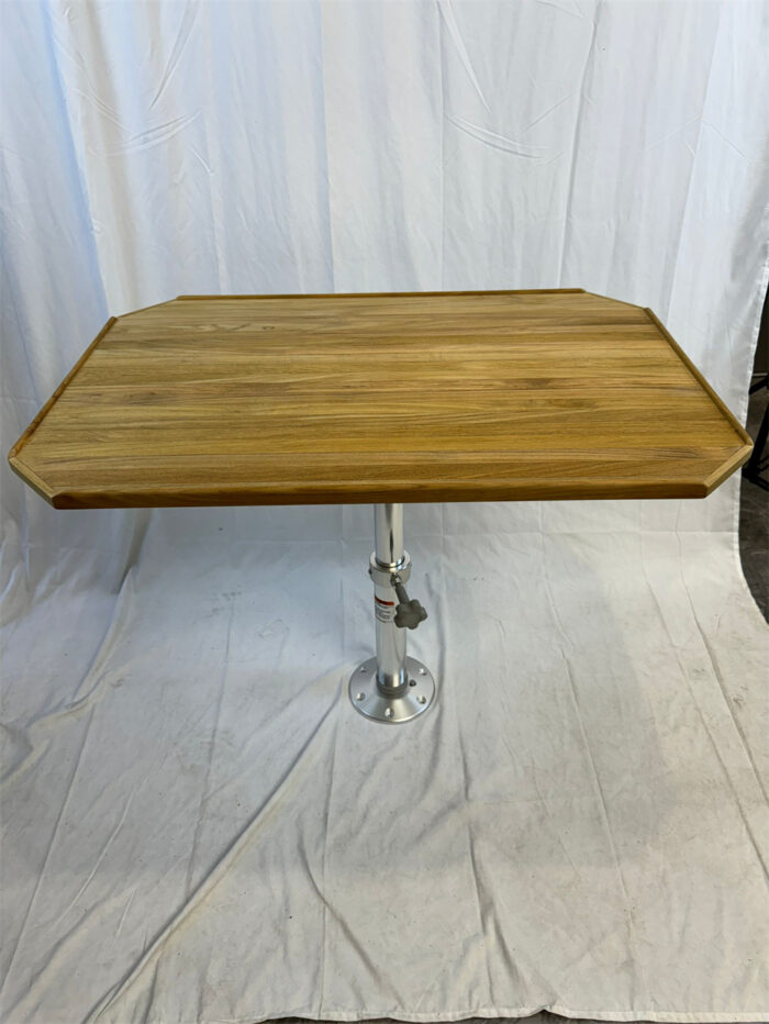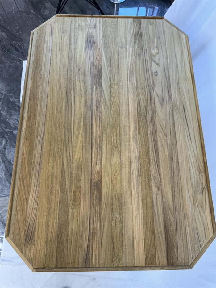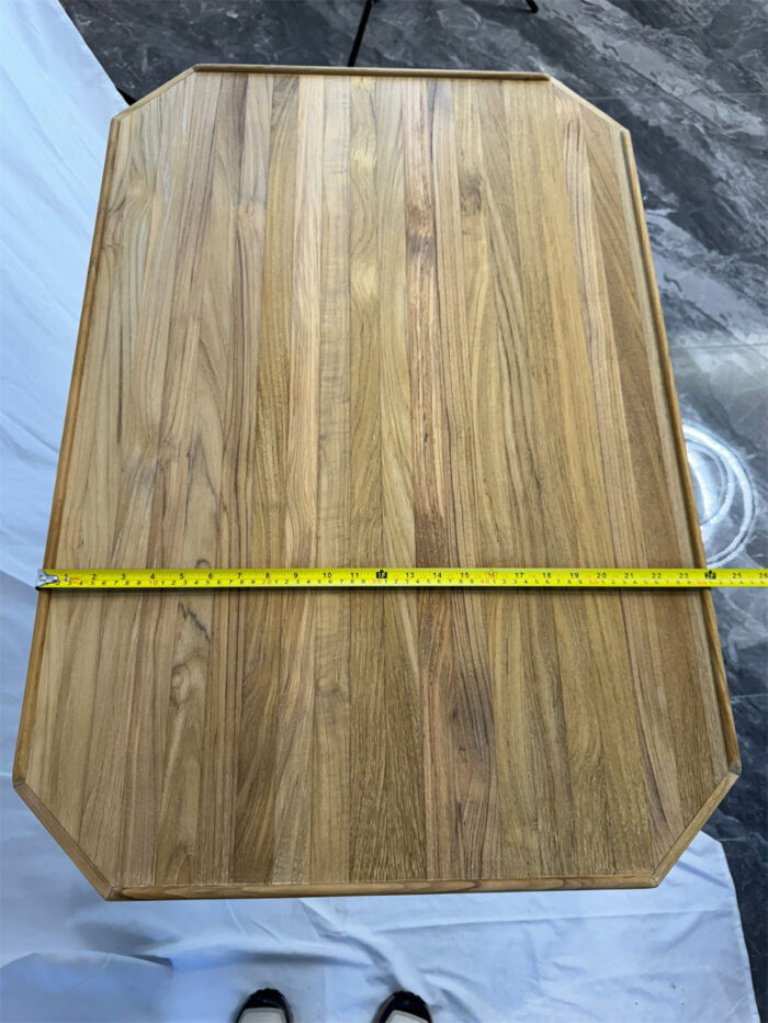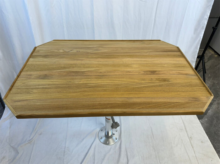 Teak Table, Rectangular with no caulk-lines. Cut corners and fiddles around the table.