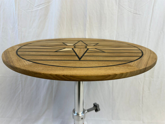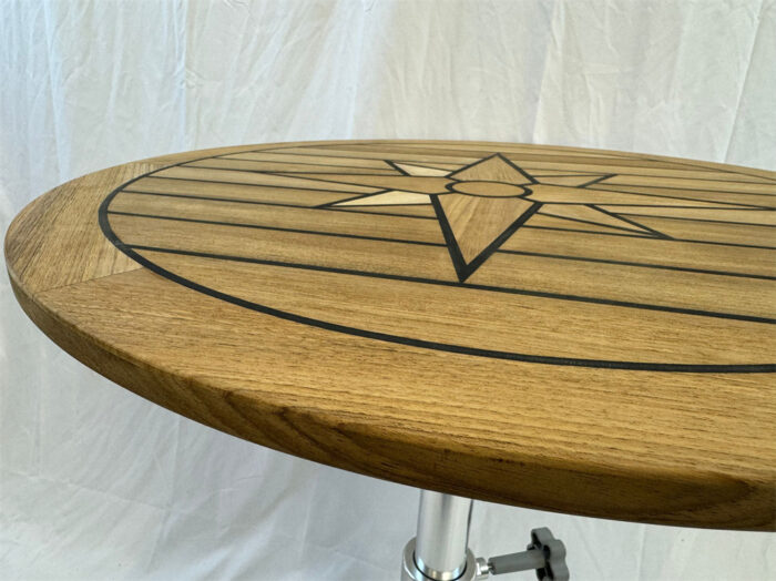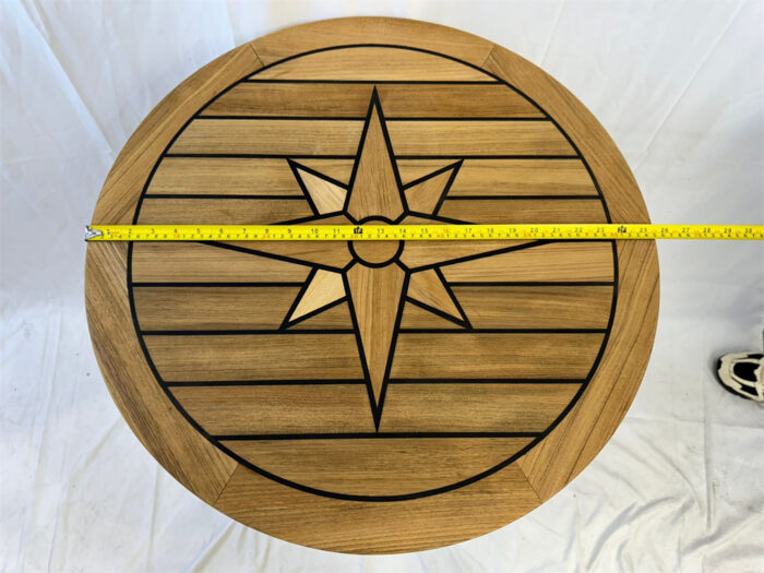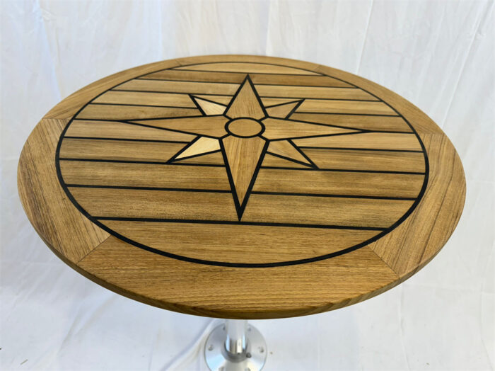 Hand-crafted round teak table with elegant compass rose design embedded in middle