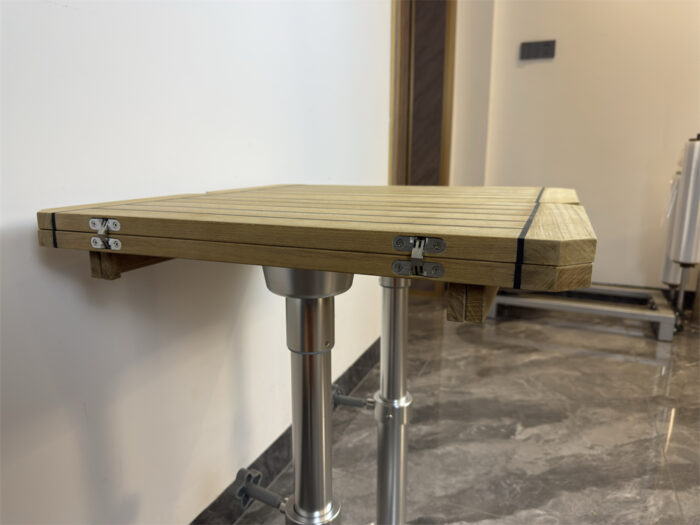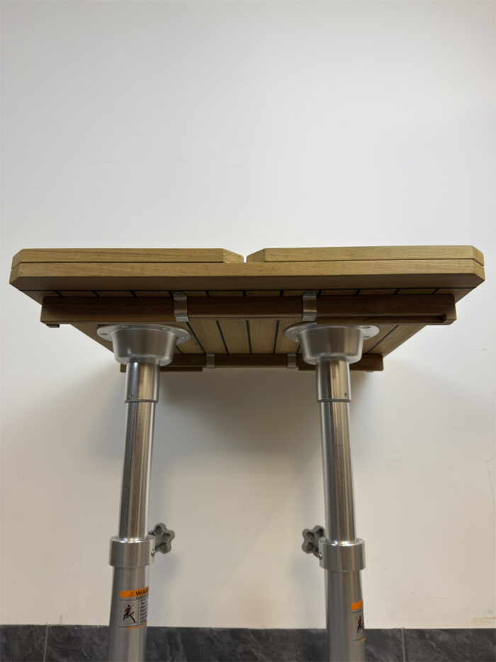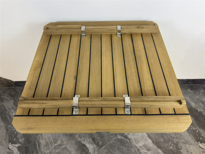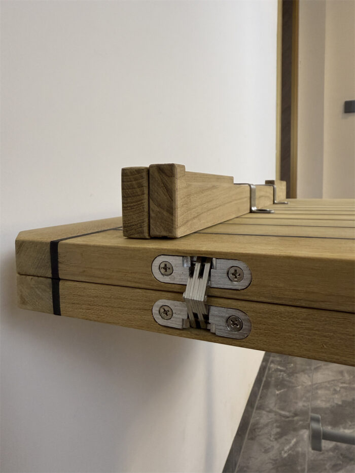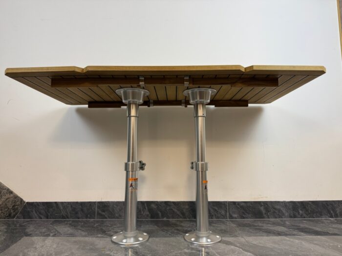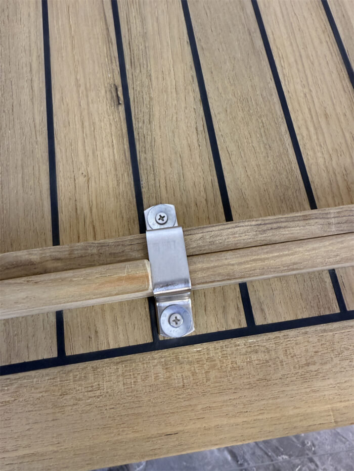 This table is same as the “normal” wing table but is folded sideways. When extended there is a Nautic Star in the middle and the teak slats are laid as to provide a uniform appearance when both folded and extended. The table has two wing supports on each side and invisible hinges.