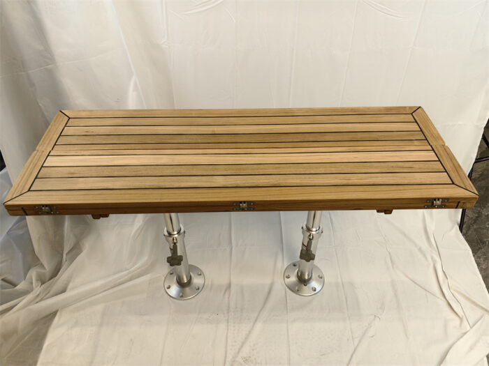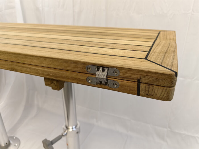 This table has two wings which double the size of the table when fully extended. When extended there is a Nautic Star in the middle and the teak slats are laid as to provide a uniform appearance when both folded and extended. The table has two wing supports on each side and invisible hinges.