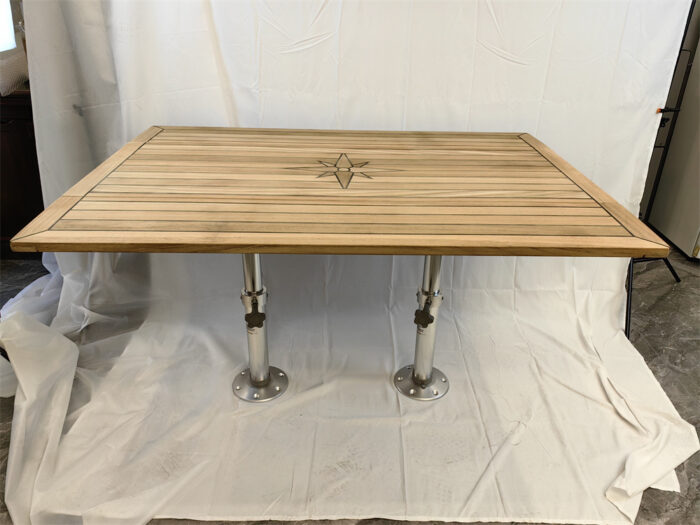 Teak Table, Folding Wings, Star Inlay, Rectangular. Teak Table, Folding Wings, Star Inlay, Rectangular.Two wings with wing supports and hidden SS hinges. The wings double the size of the table when unfolded.
