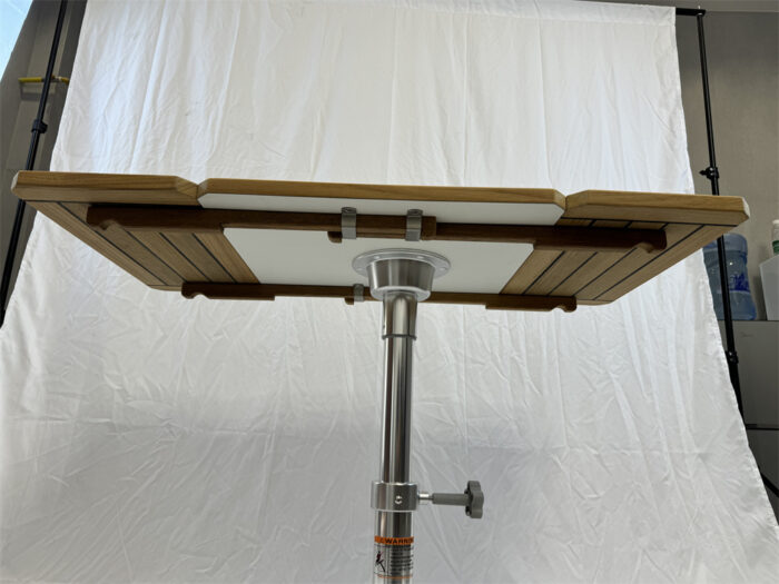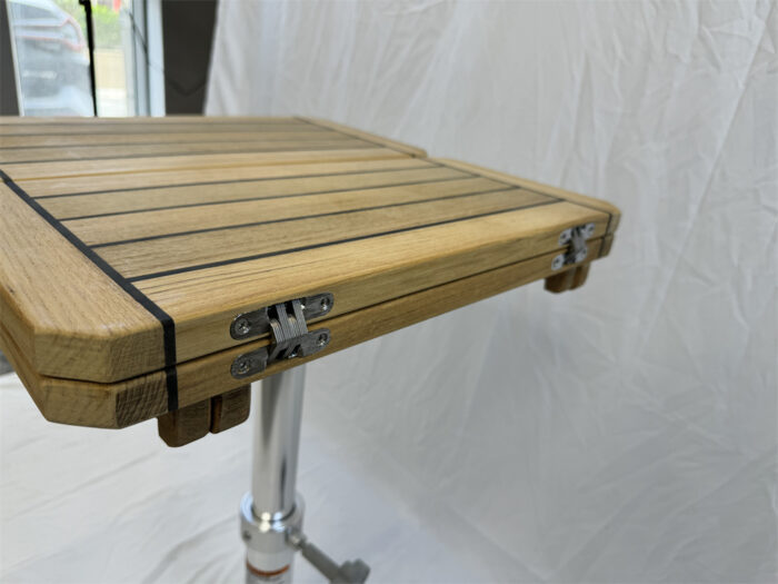 This table is same as the “normal” wing table but is folded sideways. When extended there is a Nautic Star in the middle and the teak slats are laid as to provide a uniform appearance when both folded and extended. The table has two wing supports on each side and invisible hinges.